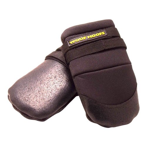 Woof Hoofs winter stlye boots are made of stretchable, neoprene material. The smaller sizes (XXS-MD) use a rubberized, ToughTek traction sole. The larger sizes (L-XXL) use a thicker, recycled tire rubber sole to better withstand the higher amount of wear and tear from a heavier dog. Woof Hoof's dual strap design ensures a secure fit that minimizes slipping, flipping or falling off.Read more Woof Hoofs Dog Boots - Winter Style Black Diamond X-Large