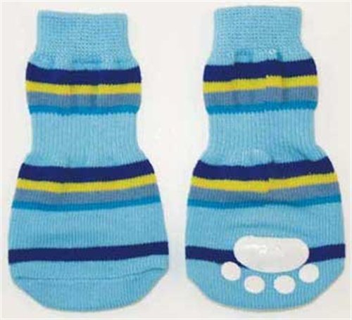 Perfect indoor footwear, prevents scratched floors. Multi-colored striped sock is made of cotton and spandex for a snug fit to help socks stay on paws.Read more Fashion Pet Lookin Good Striped Slipper Socks for Dogs, Small, Blue