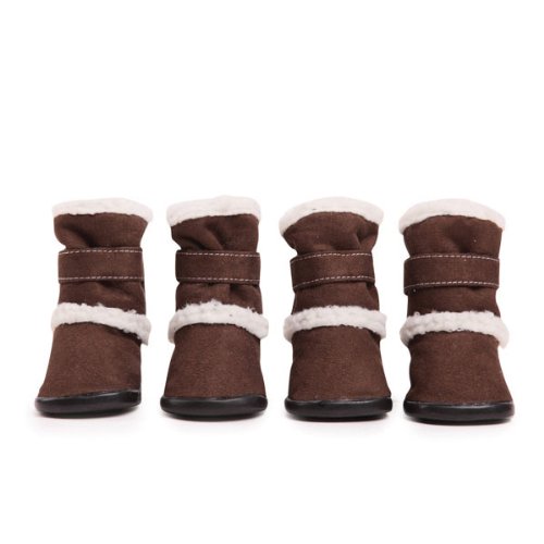 This trendy east side collection classic sherpa dog boots make a fashionable statement while keeping pets paws warm. Features a faux suede design with sherpa accents, a zippered back and velcro closures. It has rubber soles to prevent slipping. Each set of 4 boots is packaged in a polybag with an insert card. Spot clean with a damp cloth. Line dry. Made of faux suede with a rubber sole. Comes in medium size and available in chocolate color. Fits paws 3-inch by 2-inch. Measures 8-4/5-inch length by 4-4/5-inch width by 3-inch height.